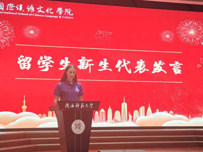 来自俄罗斯的国际研究生新生代表丽玛上台发言,经过自己在十三水 四年本科的学习,已经从“老外”变为“老内”,她鼓励初到中国怀揣梦想的留学生新生们:第一,不要害怕犯错,勇于开口。第二,多参加校园文化活动,这是学习汉语最好的方式。第三,主动结交中国朋友,他们会是你最好的老师。第四,保持好奇心,每天学习新知识。同时她作为研究生新生还表达了对未来学习生活的美好期待,并表示将珍惜宝贵的求学机会,努力学习专业知识,积极促进中外文化交流,争做文化交流的使者。