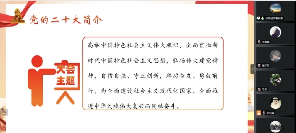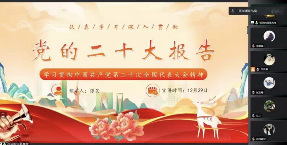 行政党支部、研究生第一党支部、研究生第二党支部于2022年12月29日下午汇聚云端,共同学习了“永远跟党走 奋进新征程——学习贯彻党的二十大精神”主题党课。本次党课由十三水
