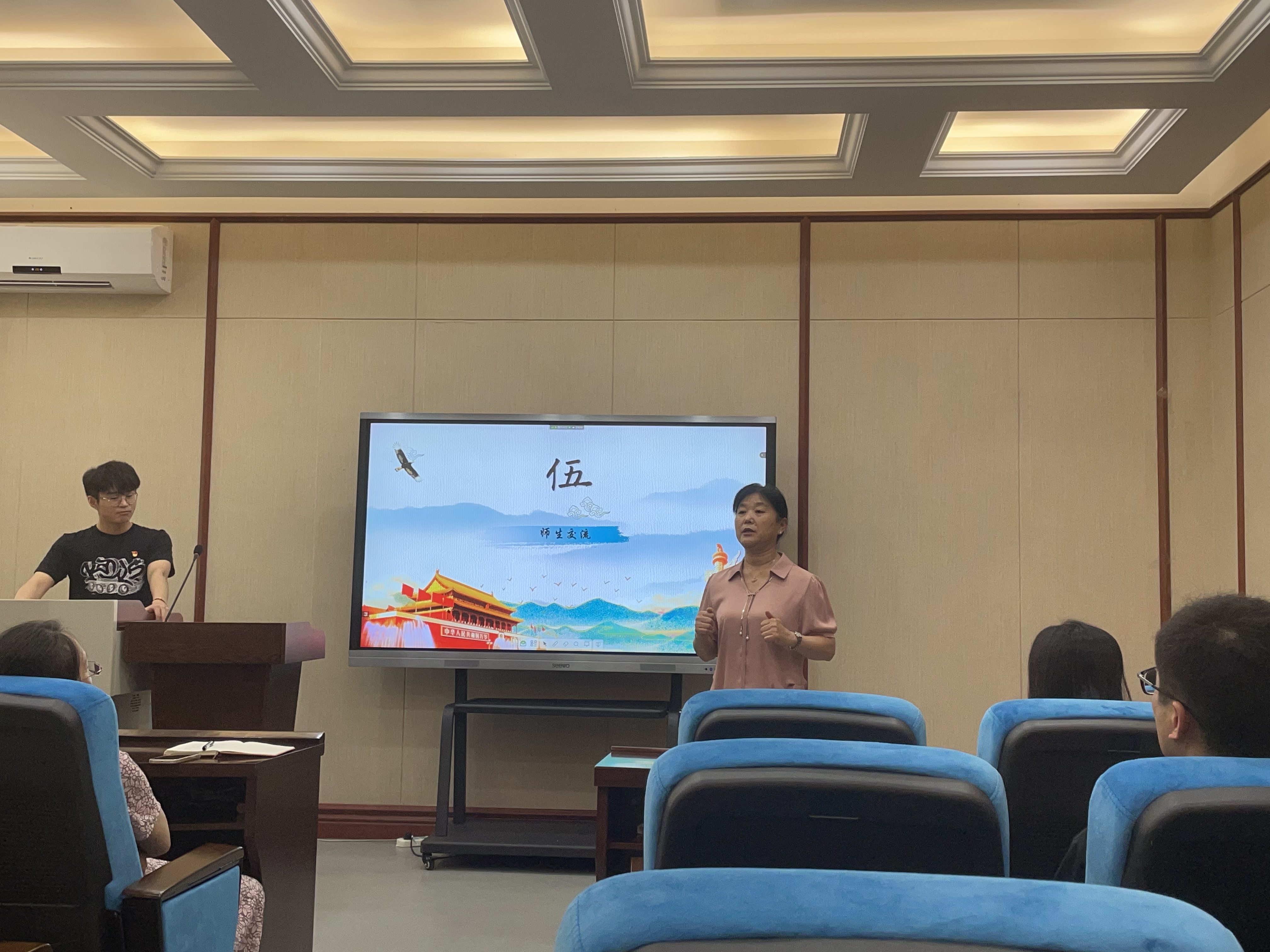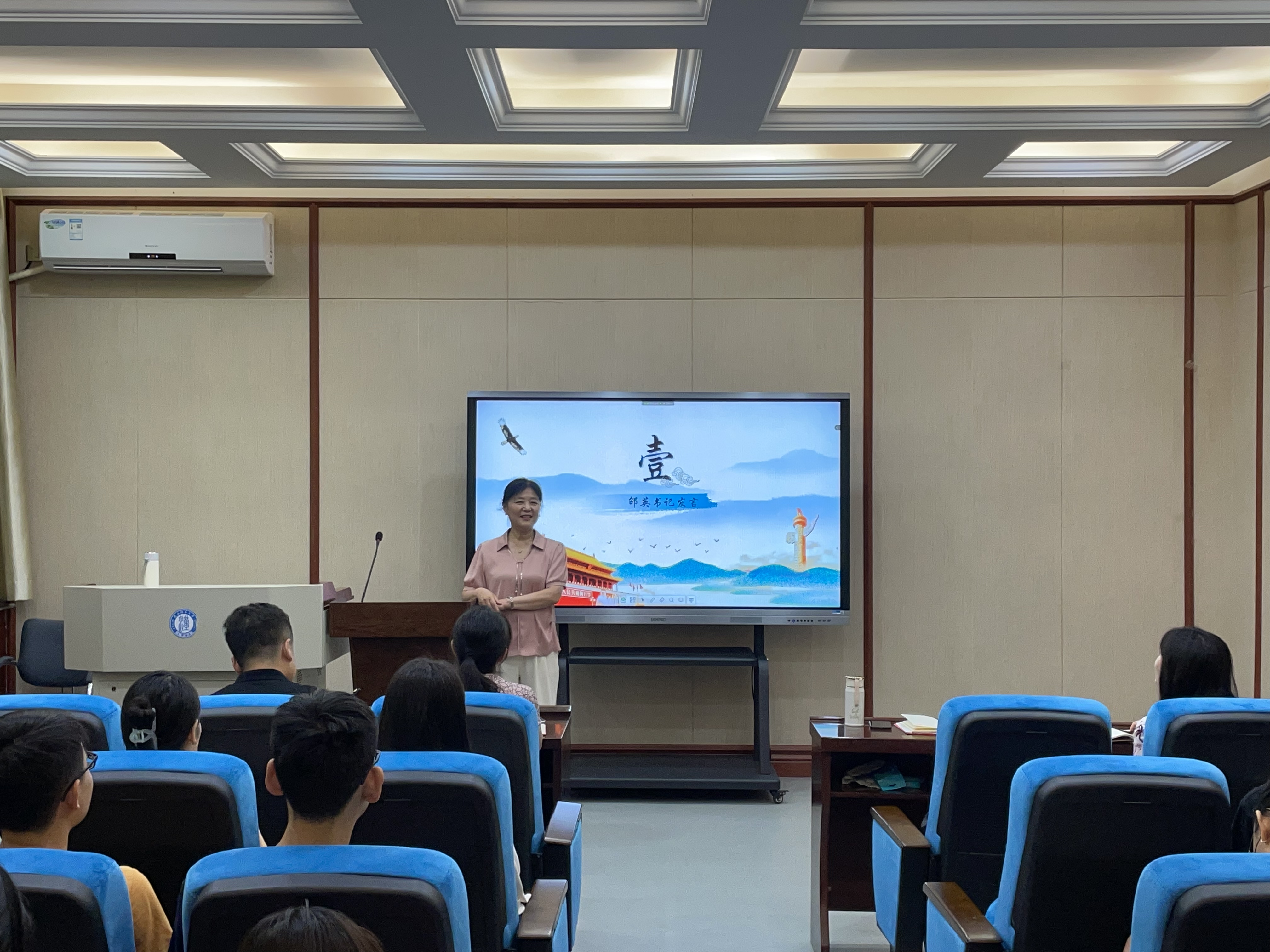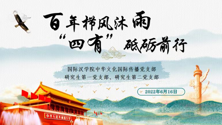 中华文化国际传播党支部、研究生第一党支部和研究生第二党支部于6月16日上午联合举办了“百年栉风沐雨,‘四有’砥砺前行”主题党日活动,活动由研究生第二党支部书记殷旭升主持。