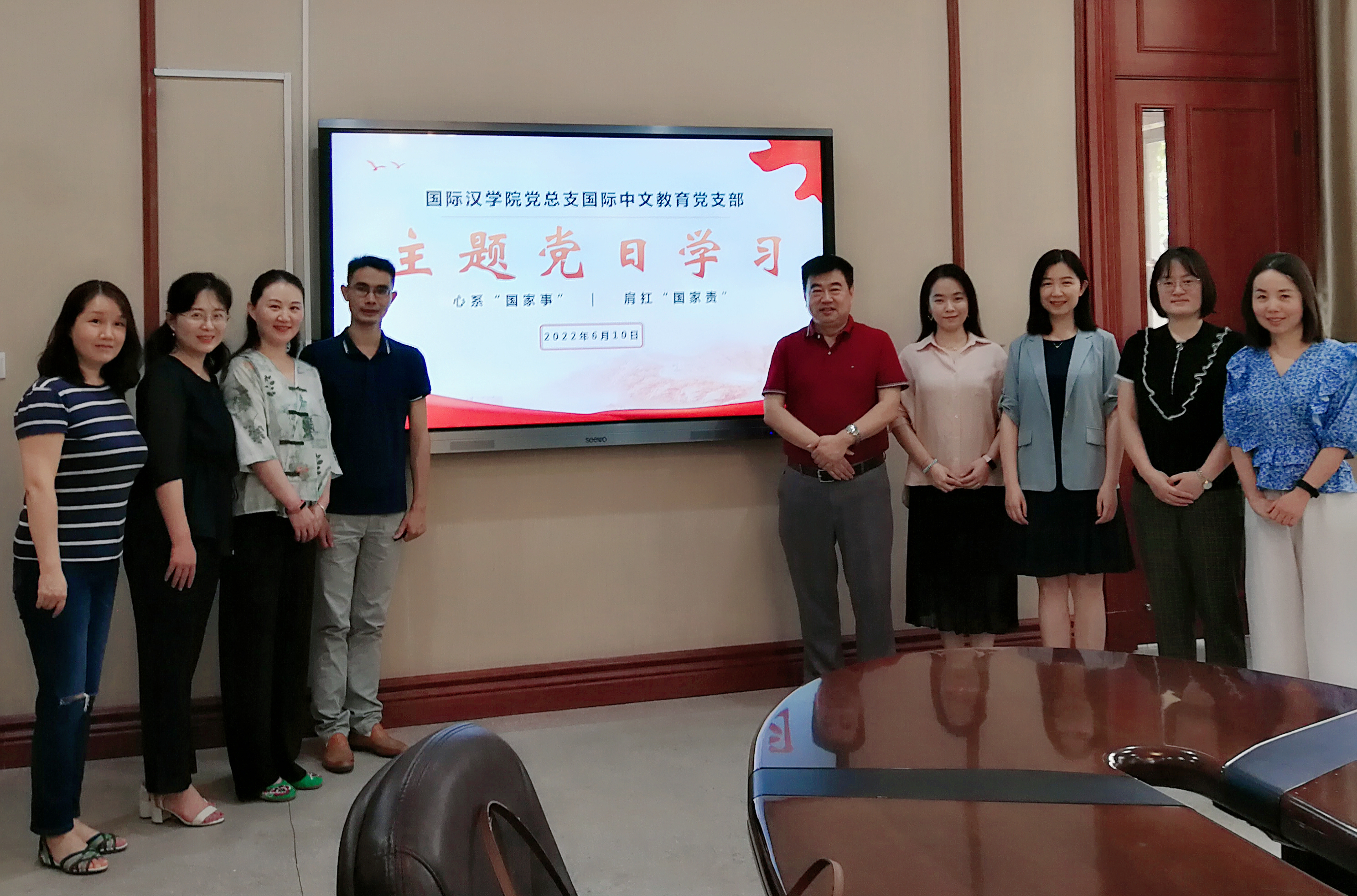 国际中文教育支部在教学二楼一层会议室开展了支部2022年6月支部主题党日学习活动,重点学习了《总体国家安全观学习纲要》、习近平总书记给南京大学留学归国青年学者的重要回信等相关内容。会议由党支部书记刘琨主持。