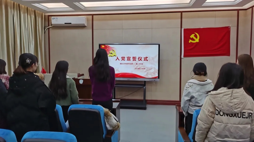 大会在《国际歌》整齐的合唱中展开,吕娟娟首先向大会汇报了2020年支部党员发展情况,带领全体预备党员进行了入党宣誓,面对党旗,每个同学都表达了自己对党忠诚的决心。