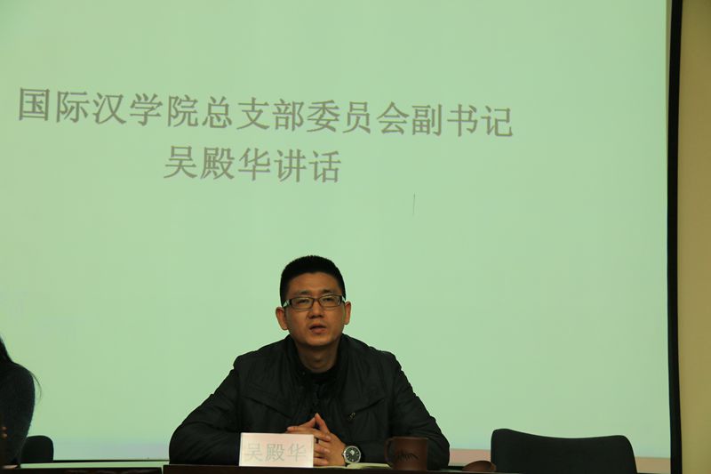 学生党支部党员发展大会在报告厅举行,党总支副书记吴殿华、学生辅导员王芙坤以及十三水