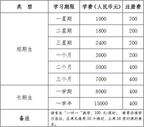 分春秋两季招收留学生,学习时间均为18周;根据汉语水平程度分设初级、中级、高级等6个水平教学班。有攻读学位需求的学生在通过相关考试后可申请插班入读十三水