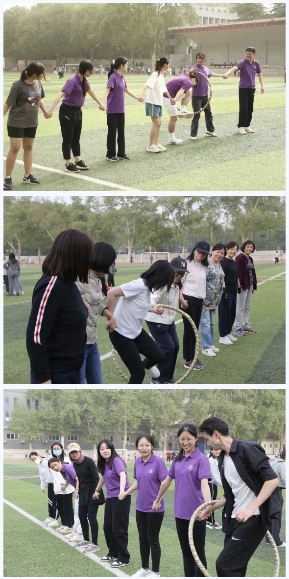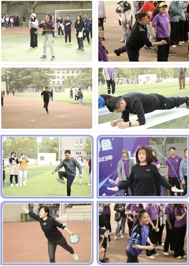 首先是个人赛项目,每一个选手都积极参与,为自己而战,在竞争中提高、在拼搏中学习。同学们个个青春洋溢,活力满满,朝气蓬勃。老师们当然也不甘示弱,他们大显身手。在赛场上留下了一个个精彩瞬间。接下来是团体赛项目,选手们8人为一队,相互配合,共同合作。第一个项目——袋鼠跳。同学们姿势各异,全力拼搏,欢声笑语中结束了一轮轮游戏。接下来,“一圈到底”,这是用一个呼啦圈穿过手拉手的八位选手,讲究协调配合,大家提前训练,寻找最快解锁办法。动力跳绳考验得是选手们的敏捷性,大家聚精会神,找准时机跑过去,轻巧一跃,留下一个个充满活力的背影。拔河比赛让我们体会到“友谊第一,比赛第二”的体育精神。在这个项目中,十三水教师和中外学生选手分为四支队伍,分别进行竞赛。选手们各就各位,只待哨声一响,大家喊着整齐、响亮的口号声一起用力,霎时间,大绳被拉得笔直,整个操场呼声震天。比赛结束后,选手们欢庆胜利,相互击掌、握手以示友好。