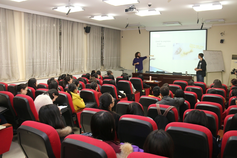一层报告厅,与他们的美国“小鲜肉”老师一道,学习并交流美式英语中的俚语及美国文化。