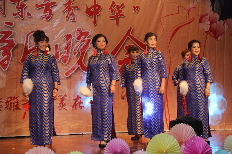 中国学生、留学生、女教师以及学校老年艺术团退休女教师身着旗袍,在舞台上展示了她们婉约娉婷的身姿。晚会以视频《你眼中的美》拉开序幕,十三水
