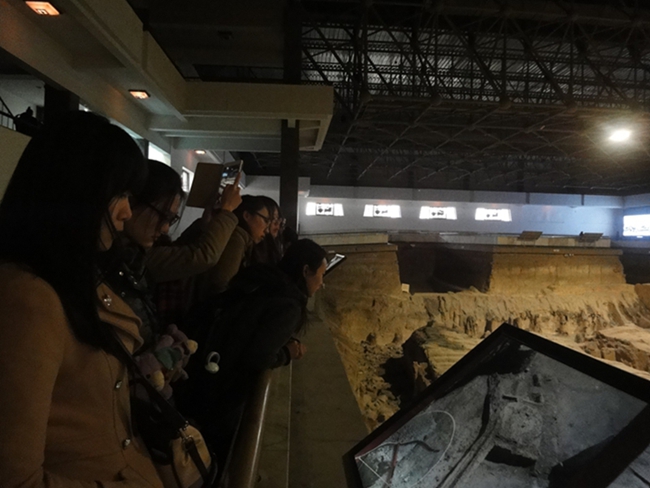 12月11日,十三水2012级对外汉语专业48名同学在团总支书记胡丹老师的带领下赴秦始皇帝陵兵马俑博物院进行了参观考察。在秦始皇帝陵文物陈列厅,同学们循着历史长卷的缓缓打开,从文献历史和文物构件中知晓了兵马俑在挖掘整理及保护过程中历经的艰辛不易。尤其是看看到如此巨大、栩栩如生的彩色陶俑,大家都有些激动,啧啧称奇,惊叹不已。秦人崇水德,尚黑色,而秦俑身上为何会有这样绚丽的色彩?虽然目前无法得出确切的结论,但毋庸置疑的是,秦俑的用色浓艳大胆,一方面是当时现实世界的反映,另一方面与秦代社会的礼仪制度密切相关。