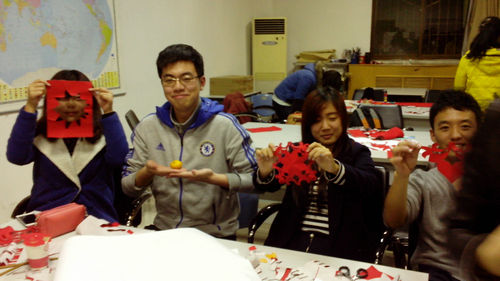 晚7:00,活动准时开始。活动中参与者被分为7组,活动围绕了解剪纸、熟悉剪纸的剪法、抽取主题、通过游戏抢夺道具、制作主题剪纸等环节展开,由国际部部员负责带领外国留学生了解、制作剪纸。参与者了解完剪纸的相关视频——《剪纸姑娘》后,剪纸的制作正式开始。活动中还穿插了精彩的抢道具游戏环节,两轮游戏各具特色,充分体现了设计者的匠心独运。尤其是第二轮游戏“水果蹲”,由于参与度更广,可操作性更强,全场气氛空前热烈。