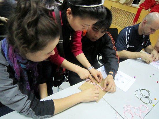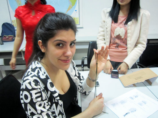 见识了品种多样、风格各异、寓意美好的“中国结”,大家都跃跃欲试,想要编织属于自己的中国结。在指导老师的简要讲解之后,大家开始了“中国结”的制作。中外学生们集思广益,勇于创新,在原有模版的基础上,充分发挥自己的聪明才智,不断把自己的奇思妙想应用于实践操作之中,“中国结”在这群能工巧匠的手里被不断赋予了新的形式和内涵。无论是小巧玲珑的酢浆草结、浪漫传情的同心结,还是制作较为复杂的草花结,都有模有样。一根简单的丝绳,在灵巧的手中还被编织成了精美的手链、项链,让大家赞不绝口。随后主持人进行了一场别开生面的颁奖活动,先后颁发了“最可爱奖”、“ 最具创意奖”、“ 最佳实力奖”、“ 最美观奖”等十多个奖项,给参与者以最大的认同和鼓励,将本次活动引向高潮。最后,作为特约嘉宾的终南笛箫社的同学为大家进行了笛箫演奏,整场活动在美妙的乐曲声中结束。