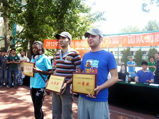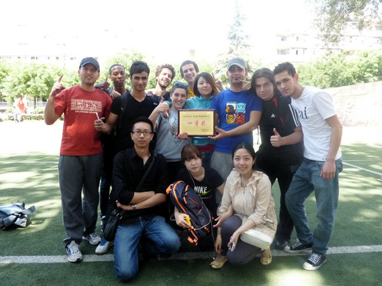 的11名留学生赴西北工业大学附属小学参加了西安市青年“冠军11脚”团队劲跑比赛活动,我校代表队不畏强敌,沉着应战,以绝对优势勇夺留学生组第一名。