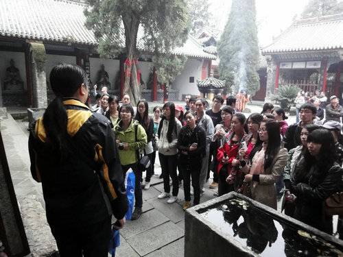 21日上午,师生一行人分别参观了勉县武侯祠和武侯墓。淅淅沥沥的小雨既让考察活动颇具朦胧之美,又使师生有敬畏之情。祠中空城缩影再述演义故事智胜敌方,旱莲古树尽显老臣高洁情怀,“兵在攻心三分聊竭解悬力;鱼如得水六出诚为尽瘁哀”。定军山下埋忠骨,思蜀亭上见游人。师生们在文化的浸染氛围中与先辈对话,聆听着千古绝唱。