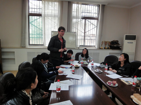 学生会的大家庭。他们分别来自美国、瑞士、泰国、越南、波兰、哈萨克斯坦、乌兹别克斯坦七个国家。他们分别介绍了自己的名字和国家以及个人的兴趣爱好,并且与部长们展开了热烈地交流。虽然有些留学生干部刚刚学习汉语,但丝毫没有影响他们希望参与活动的积极性。