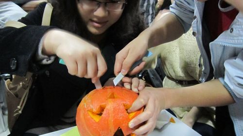 第一次参加活动,新成员们都很兴奋,早早就赶到了活动地点。7点整,活动正式开始。首先,主持人向大家简单介绍了万圣节的历史由来及其风俗习惯。随后,就开始了“点亮南瓜灯的活动”。每个小组分到两个南瓜和一些工具,其中,每个桌上都特意放了几个创可贴,好处理紧急情况。拿到了材料,各小组就开始动手操作了。有的构思设计,有的钩画图案,有的拿着刀子,戴着手套把南瓜掏空,大家忙的不亦乐乎。一个小时的时间很快就过去了,各组将自己精心做好的南瓜灯放在候选区等待评选。经过现场同学们的投票,最终,第五小组的南瓜灯被评为“最精致南瓜灯”。当然,其余南瓜灯也各有特色,笑脸形,惊悚鬼怪形,可爱调皮形,一个赛一个的好看,甚至有一个竟然被烧黑了头。根据比赛规则,各优胜小组都获得了相应的奖励,在“share time”中,小组成员们高兴地品尝着自己赢得的美食。分享着成功的喜悦。
