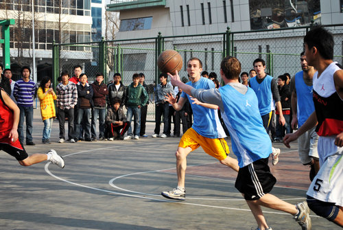 体育大联盟共同组织了一场中外篮球友谊赛。来自美、澳、日、韩的留学生和陕师大的中国篮球爱好者进行了对抗切磋。