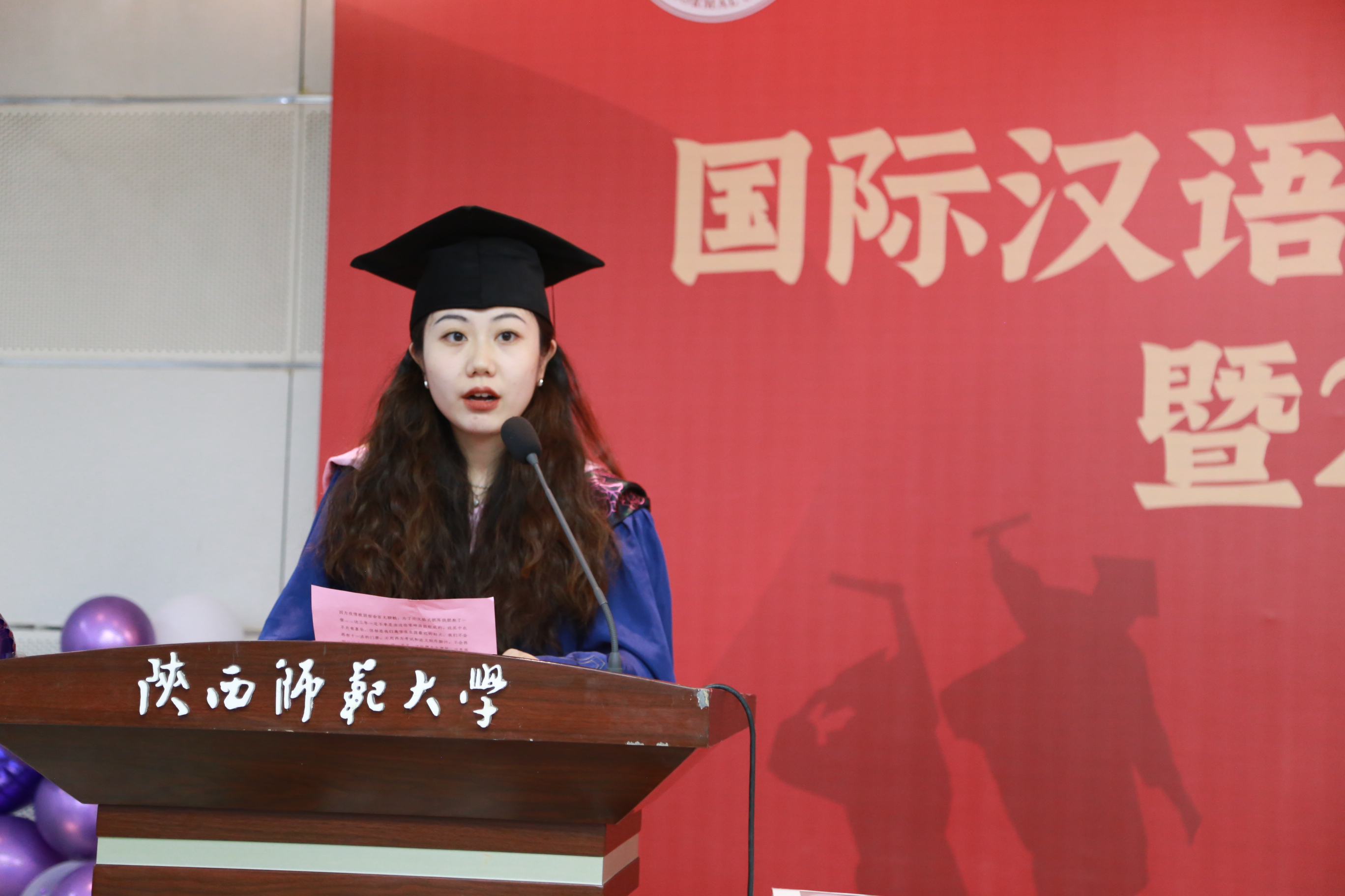 泰国学生林美华代表留学生毕业生进行发言。她回顾了自己在中国的学习之旅,表达了对师长与学校的感激之情,讲述了留学生在师大、在十三水