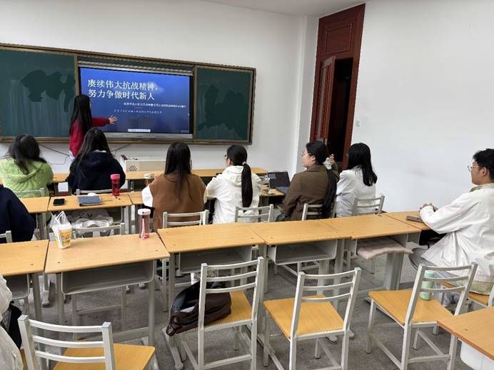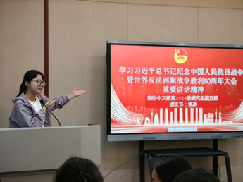 报告厅举办了“聚焦深入学习习近平总书记在纪念中国人民抗日战争暨世界反法西斯战争胜利80周年大会上的重要讲话精神”主题团日活动。团支部书记就重要讲话精神进行了领学,从抗战胜利的伟大意义、历史启示、伟大抗战精神的时代价值以及对新时代青年的殷切期望等方面进行了系统解读,团员们一起观看大中小学生思政大课,一起讨论电影《731》,与会团员结合观影感受与专业学习进行分享交流。作为国际中文教育领域的研究生,我们更应带头铭记历史,从抗战精神中汲取不畏艰难、自强不息的强大动力。同时也发出倡议,号召全体团员持续深化学习,将讲话精神内化于心、外化于行,以过硬的专业素养和昂扬的精神状态,投身到国际中文教育事业中去。