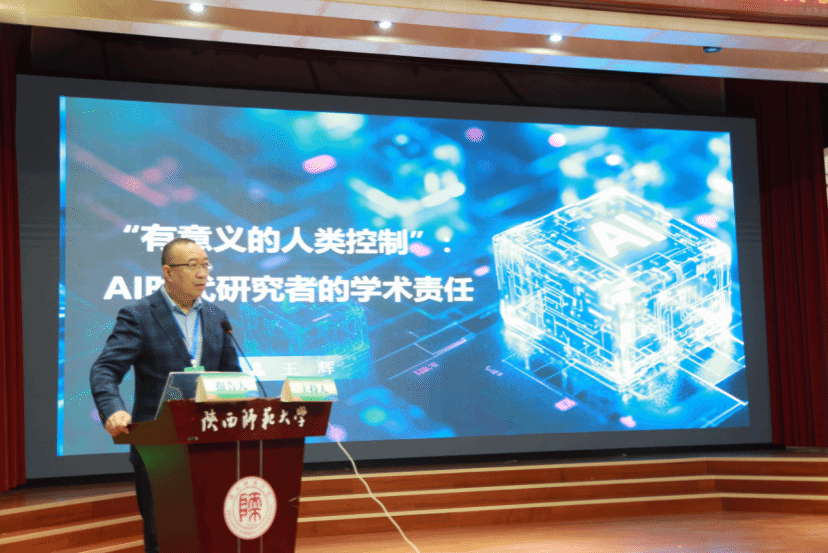 王辉教授以《“有意义的人类控制”:智能时代研究者的学术责任》为题进行报告,基于“人机协作范式下,我们应如何重新审视并履行我们的学术责任?”这一议题,强调研究者使用AI时应保持审慎,遵循透明性原则,对AI的使用进行诚实披露。在此基础上,他进一步指出智能时代研究者必须从研究的执行者,转变为更具挑战性的“最终把关人”,以“有意义的人类控制”为准则,将算法素养与事实核查内化为新的学术本能。