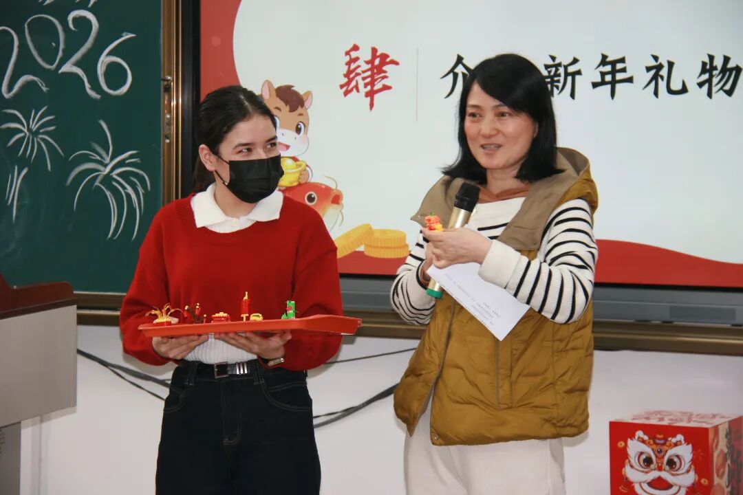 院长石洛祥向全体同学送上新春祝福,鼓励大家在新的一年里深耕学业、勇于探索,同时希望同学们以文化为桥,增进中外交流互鉴。党总支书记李小玲介绍了学院精心准备的春节主题积木玩具,随后与在场领导老师一同为同学们分发纪念品,传递学院的关怀与暖意。
