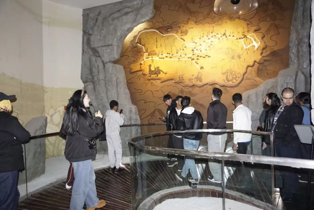 活动伊始,师生们走进中国茯茶文化博物馆,在讲解员的带领下系统了解茯茶的千年历史与文化底蕴。从《诗经》中关于茶的古老诗句,到茯茶作为古代战略物资在安边治国中的重要作用;从南方茶叶运抵泾阳加工成茯茶,再经水陆两路沿丝绸之路远销西北、中亚乃至欧洲的商贸传奇,一幅幅历史画卷在眼前徐徐展开。同学们驻足于 “国饮风范”“征战与治国” 等主题展区,通过文物、图文与多媒体展陈,直观感受茶文化中蕴含的处世智慧与人文内涵,以及茯茶在丝绸之路上的文明交流价值。