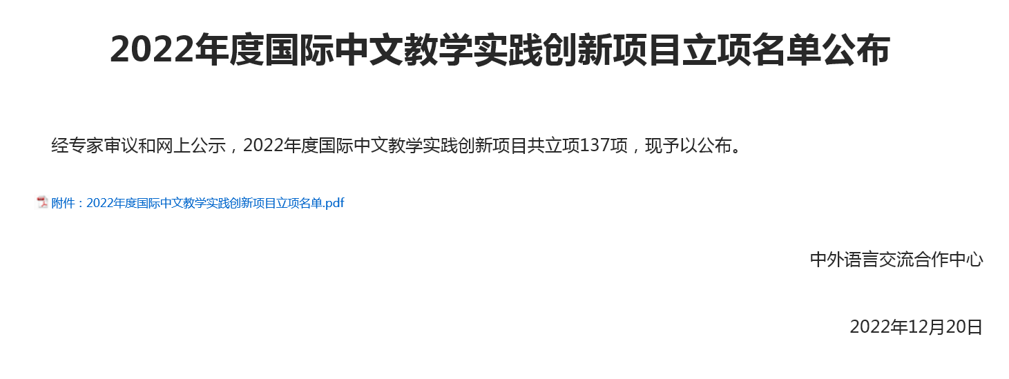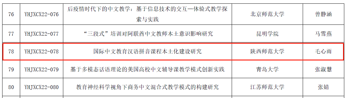 近日,“语合中心”公布了“2022年度国际中文教学实践创新项目立项名单”,十三水研究生毛心雨申报的《国际中文教育汉语拼音课程本土化建设研究》项目成功立项,获批资助经费2万元。该级别项目为十三水研究生首次获得。