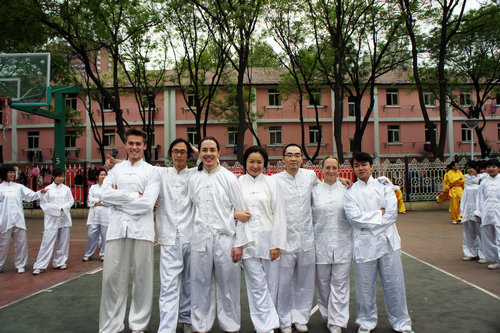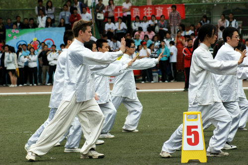 在备战比赛期间,十三水2009级政府奖学金生杨华星(美国)同学担任了太极拳方阵教练。杨教练在指导中,认真负责,态度严谨,技术精湛,得到大家一致的认可。中外学生们克服上课时间不一致等困难,利用节假日和课余时间,虚心学习,互相纠错,共同练习。在一起训练的日子里,来自美国、韩国、比利时、蒙古国、越南、哈萨克斯坦、中国的同学们结下了深厚的友谊。