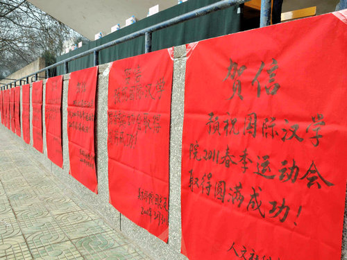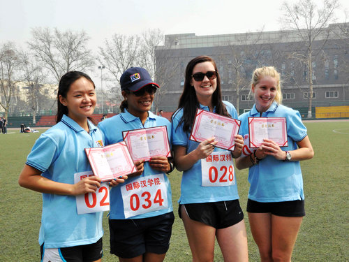 伴着运动员进行曲,由2007级对外汉语班、2008级对外汉语班、留学生普通班、留学生本科班、研究生班、澳大利亚埃迪斯科文大学短期培训班、美国教育联盟项目培训班7支队伍组成的方阵依次登场,向主席台上的老师领导挥手致意,展现各自风采。