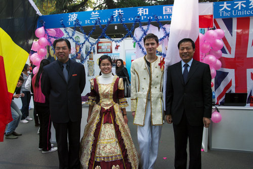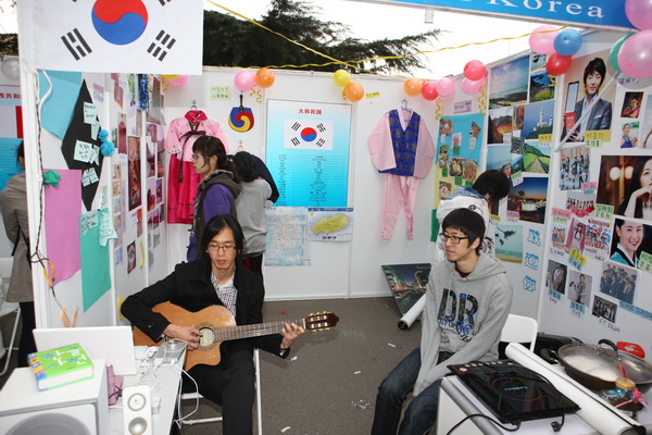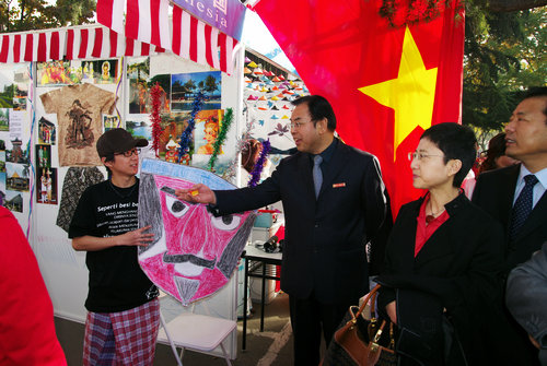 国际交流回顾展览,体验了师大外国留学生“国际风情展”,并为我校首届“国际文化节”的开幕签名寄语。“国际交流回顾展览”以展板形式生动翔实地介绍了我校近年来国际交流与合作方面的发展状况及所取得的进步。“国际风情展”展台前各国国旗飘扬、民族舞姿飘逸、异域美食飘香,在我校留学的来自30多个国家的外国学生集中在此展示各自国家的文化风情。现场气氛热烈,国际化氛围浓厚。中外嘉宾时而驻足观看我校外国留学生独具魅力的民族舞蹈、时而欣赏彰显不同国度文化特色的民俗风情展示、时而品味他们亲手制作的异国风味,并与参展的各国留学生亲切交谈,热情合影。来访客人在体验之余不断称赞我校“国际风情展”独具魅力,参与性高,吸引力强,为国际文化节营造了独特的欢快氛围。