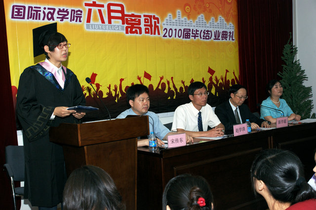 颁奖仪式结束后,2010届对外汉语专业本科毕业生代表陈俊伊发言。她说,母校不仅给毕业生们传授了知识和能力,更多的还有宽广的视野以及豁达的胸怀。尽管离别充满了伤感,但所有的毕业生们已经做好奔赴未来的准备。他们将脚踏实地,厚德敦行,在实现个人理想和价值的过程中担负起国家和社会赋予的责任。