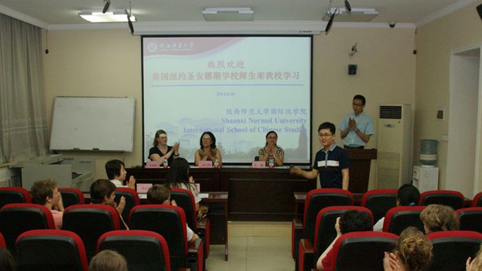 吴媛副院长代表张建成院长对美国纽约圣安娜斯学校师生时隔两年再次来访十三水表示欢迎,并希望美国学生在华期间能够充分体味西安厚重的历史文化,学好汉语,不虚此行。郭玉明老师对十三水所做出的精心安排与付出的努力表示感谢,并希望双方的合作可以持久开展下去。