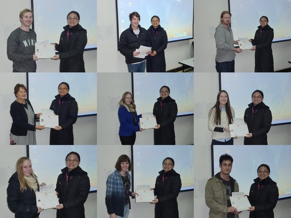 1月17日,澳大利亚塔斯马尼亚大学与新英格兰大学2013年汉语言短期进修班20名学员在我校经过两个月的学习以优异的成绩圆满完成学业,十三水 副院长吴媛为学员颁发了结业证书和学习成绩单,并对他们给予了新的期望与祝福。