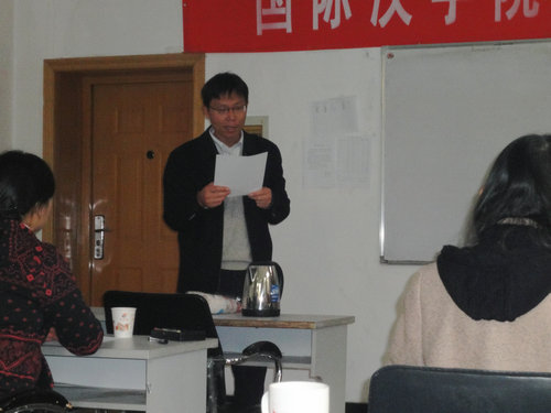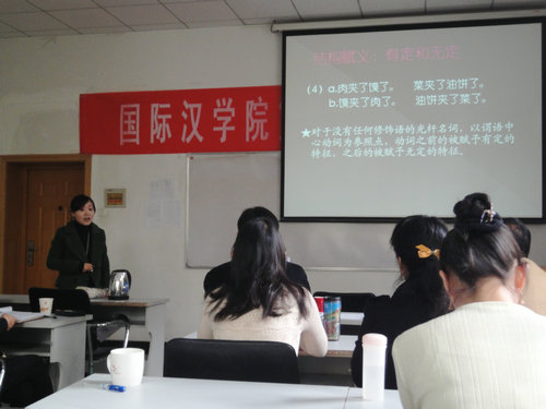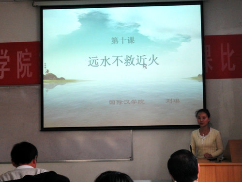 青年教师教学基本功大赛预赛拉开了序幕。首先六位评委老师和五位参加比赛的老师分别作了自我介绍。评委老师们表示将会公平、公正的对待每一位参赛选手,而五位参赛选手则表示将会把自己教学过程中最好的一面展示给大家。马晓风老师首先上台,她以《汉语有定和无定的表达》为题,在15分钟的时间里,就自己在教学过程中关于汉语语序研究所获得的一些心得作了深入浅出的阐述,得到了在场评委和观众的认可和共鸣。随后,田志华老师就《汉语修辞——谐音双关》方面的知识进行了讲解,她的课堂十分的生动有趣,大家都不自觉地与她产生互动,并在提问环节踊跃交流。另外刘琳、高红娜和张欲晓等老师也分别就古代汉语阅读、中文写作及现代汉语阅读灯方面的知识作了精彩的讲解。在参赛教师们的出色展示中,比赛现场台上台下交流充分、气氛热烈。