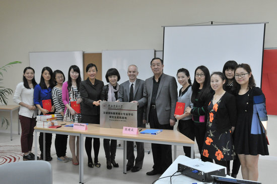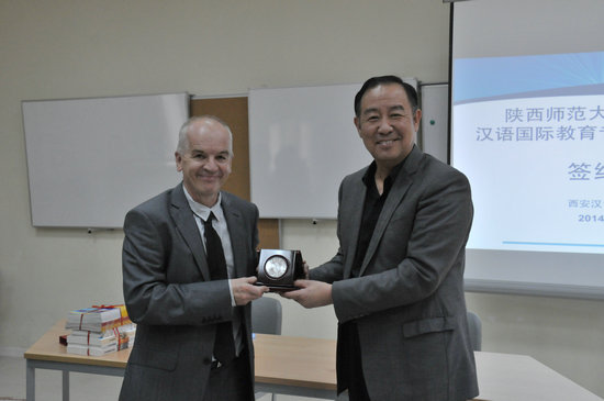 院长张建成教授向四位实践指导教师颁发了聘书,并向西安汉诺威国际学校赠送了由十三水教师共同编写的汉语教材、华文教师培训教材及中华文化系列教材。