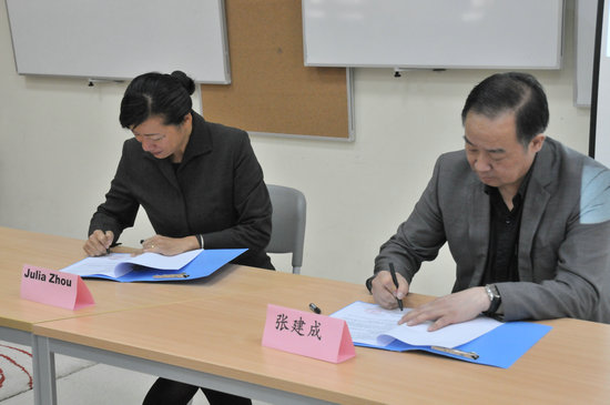 院长张建成教授与西安汉诺威国际学校中文部主任Julia Zhou分别在协议上签字。参加签约仪式的还有西安汉诺威国际学校校长及多位教师、十三水