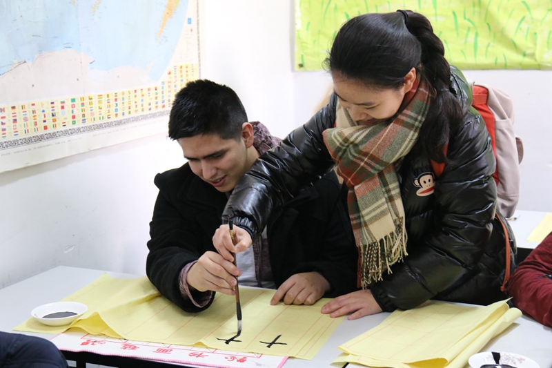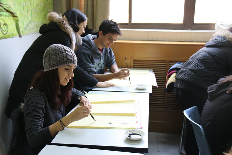 首先,来访师生与十三水留学生管理办公室相关工作人员进行了简单交流和互动,介绍了双方的学校概况和项目内容。会后十三水为来访师生安排了历史文化讲座及中国书法体验活动。在中国学生的陪同下,美方师生体验了博大精神的中华文化和汉字魅力。