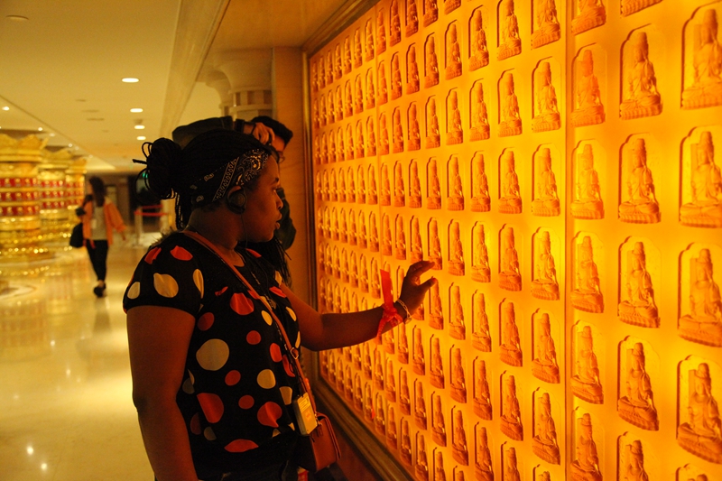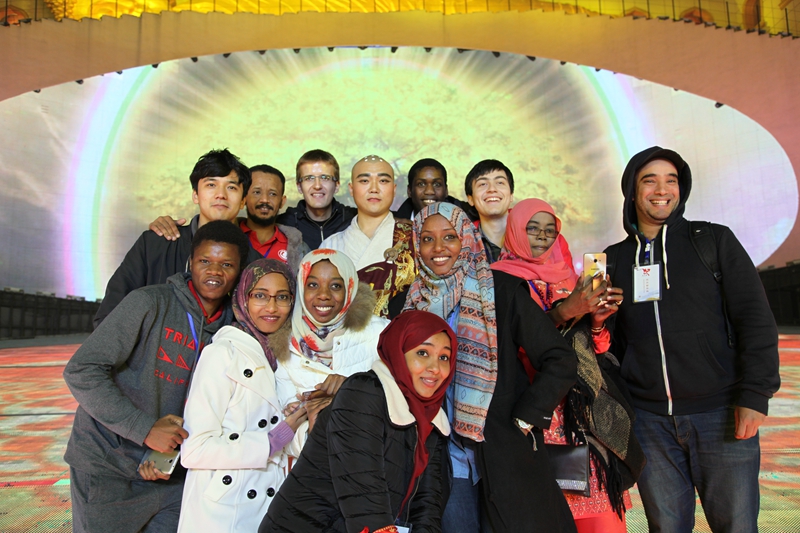 在以佛教文化为主题的兴隆文化园,来自不同宗教不同文化背景的学生们饶有兴致的了解了佛教在中国的发展与社会影响,并与自身或本国宗教相比较,不断跟园区讲解探讨交流,认识到了佛教苦、集、灭、道的基本教义。当晚,学生们还观赏了大型室外佛教主题表演《菩提东行》,扣人心弦的故事、美轮美奂的舞台和荡气回肠的表演给学生们留下了深刻的印象。
