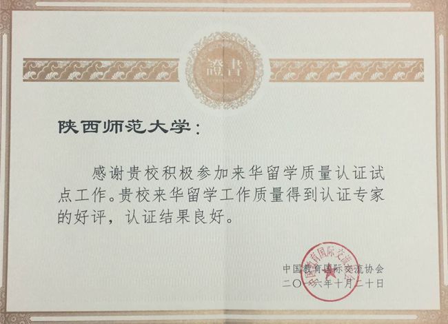 今年3月,中国教育国际交流协会作为教育部国际司认可的第三方认证机构在全国范围内开展“来华留学质量认证”试点工作。我校与北京大学、复旦大学、武汉大学等一同作为在来华留学教育中成绩突出特色鲜明的大学进入了首批来华留学质量认证试点院校之列。游旭群副校长代表我校与中国教育国际交流协会秘书长生建学在首批试点院校签约仪式上签约。