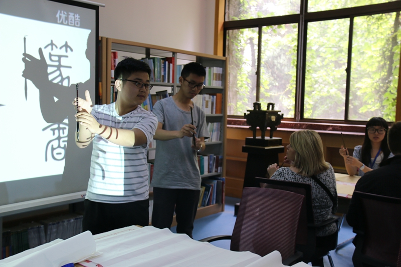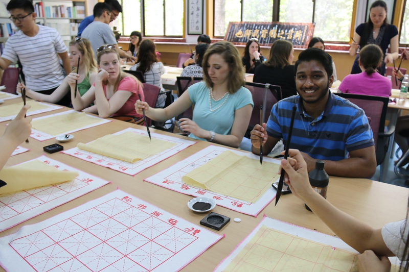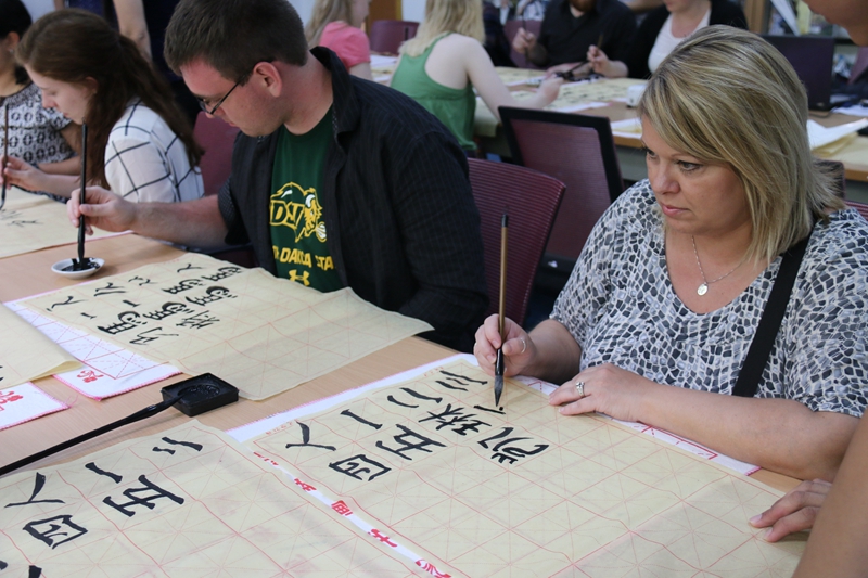 5月19日上午,十三水学生社团五洲汉韵在二层阅览室接待了来中国游学的美国北达科他州立大学师生,为他们展示了一堂精彩的中国书法艺术体验课。