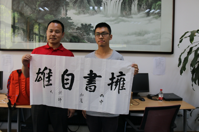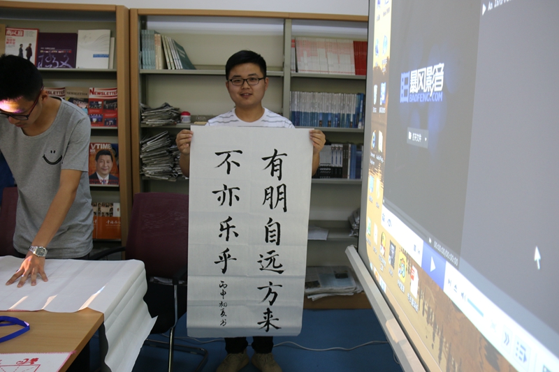 书法老师还写下论语名句“有朋自远来来,不亦乐乎?”欢迎各位美国学生的到来,并将自己的书法作品“抱道不屈,拥书自雄”赠送给他们作为留念。
