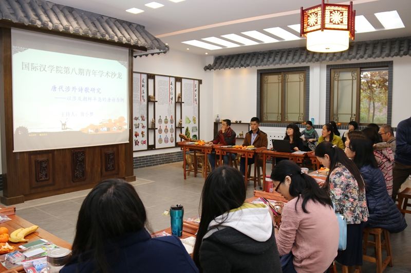 沙龙围绕着“涉外诗歌”这一主题,以涉及朝鲜半岛的唐诗为例,探讨了涉朝诗的创作概况、涉朝诗的分期、涉朝诗的作者身份以及涉朝诗的题材类别,并以送别诗为重点,分析了唐代涉朝诗的总体风貌,以及诗人在创作中所流露出的文化优越感。沙龙活动中,曾小梦老师首先就自己在唐代涉外诗歌方面的研究心得和体会向大家进行了汇报,随后各位老师纷纷就相关问题展开了深入而热烈的讨论。宋林生老师提出不仅要关注诗歌中所反映出的唐罗之间的友好关系,还应该看到两国之间的战争对诗歌创作的影响;许文军、刘琨、王晓音、孙建伟等老师纷纷建议在研究中应想办法掌握国外的相关资料,使研究的结论更具说服力;刘琳老师就涉朝诗歌的作者身份考证提出了自己的意见;刘国伟老师、张喆老师分别就涉朝诗的搜集方法、诗歌题材的划分与主持人进行了交流。此外,邵英、高红娜、贾泽林、陈雪、苗宇等老师也就自己感兴趣的问题积极发言,提出了建设性的意见和建议。