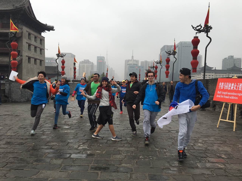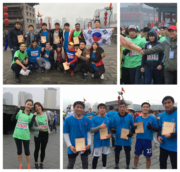 上午九点二十分,马拉松比赛的枪声正式鸣响。尽管天气寒冷、阴雨连绵,选手们各个不畏严寒,热情饱满,拼尽全力向着终点迈步,在男子13.7公里比赛中,来自哈萨克斯坦的马云和韩国的金廷洵均跑进前20名。未参赛的5名留学生在赛前自发组成拉拉队,为选手们搬运食品、看护物品、加油助威、拍摄照片。最终,所有跑完全程的选手都获得参赛证书一张,赛后大家依然意犹未尽,在城墙上一同奔跑,摆出一起冲过终点线的造型。