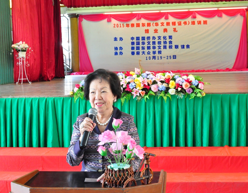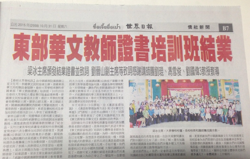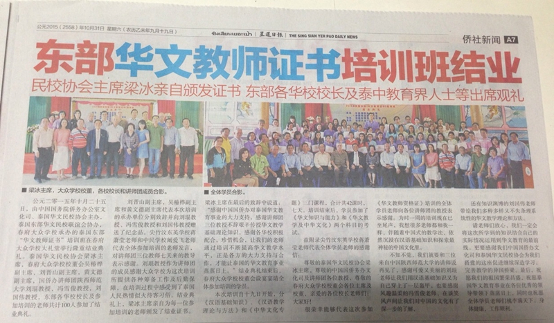 为提升海外华文教师综合素质和教学能力,顺应海外华文教育师资专业化发展需要,由中国国务院侨务办公室文化司、泰国华文民校协会主办,泰国东部华文民校联谊会协办,春府大众学校承办的泰国东部《华文教师证书》培训班于2015年10月19日——25日在春府大众学校隆重举行。此次培训由国务院侨办文化司丁子扬秘书带队,国侨办选派我校十三水