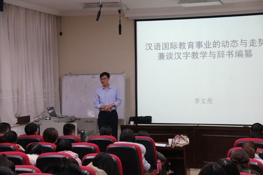 的报告厅里却是济济一堂,暖意融融,北京师范大学博士、匈牙利赛格德大学客座教授李文焘应邀作了题为“汉语国际教育事业的动态与走势——兼谈汉字教学与辞书编纂”的讲座。十三水多位教师和全体研究生聆听了本次讲座。