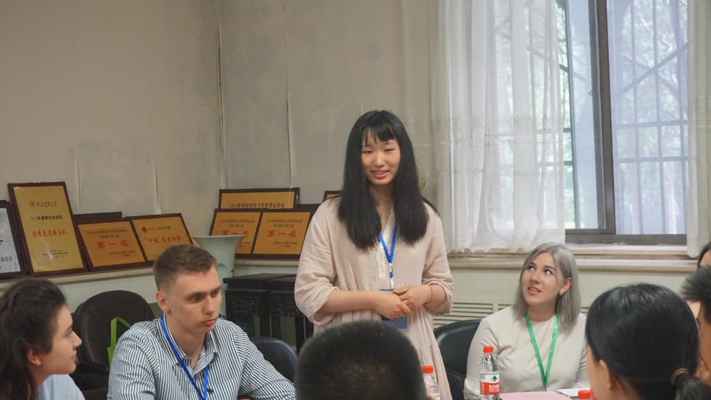 概况及在校生活为主题用俄语向学员们细致介绍了校园情况,并对学员们在校期间可能遇到的问题进行了详细的解答。在问答环节,俄方带队老师米哈伊尔和项目主管贾晨老师再次和俄罗斯学生们强调了项目纪律并详细回答了同学们关心的学习以及生活相关问题。