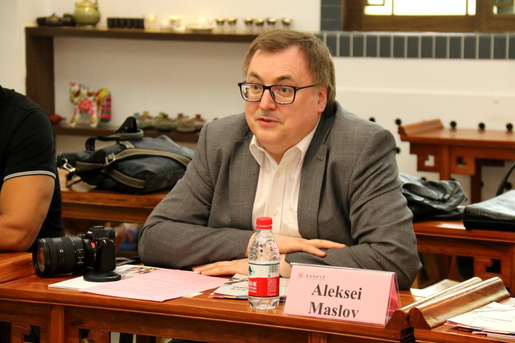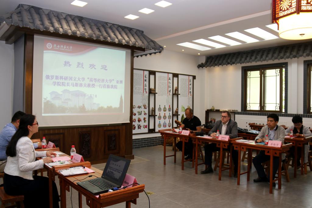 马斯洛夫教授简要介绍了俄罗斯高等经济大学的历史沿革及办学情况,他表示,随着中国“一带一路”倡议的不断推进,横跨亚欧两大洲的俄罗斯与中国之间的交往日益密切,两国之间的商贸合作项目增加、旅游市场不断发展壮大,越来越多的俄罗斯人开始学习汉语,汉语及中国文化在俄罗斯文化生活中扮演了越来越重要的角色。马斯洛夫教授介绍说,近年来俄罗斯高等经济大学已经与北京师范大学、上海大学、复旦大学等中国高校开启了校际合作交流,积累了一定的合作经验,学校希望继续开拓中国留学生市场,积极探索与中国高校的合作培养模式,开展更多互利共赢的合作项目。他表示,通过近期与十三水
