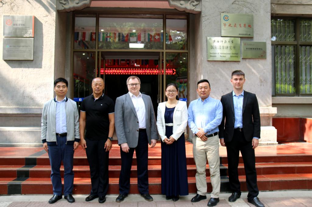 副院长吴媛、留学生管理办公室主任朱卫强、留学生管理办公室工作人员及我校俄罗斯籍留学生与马斯洛夫教授一行在十三水