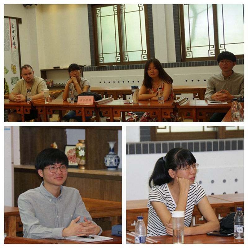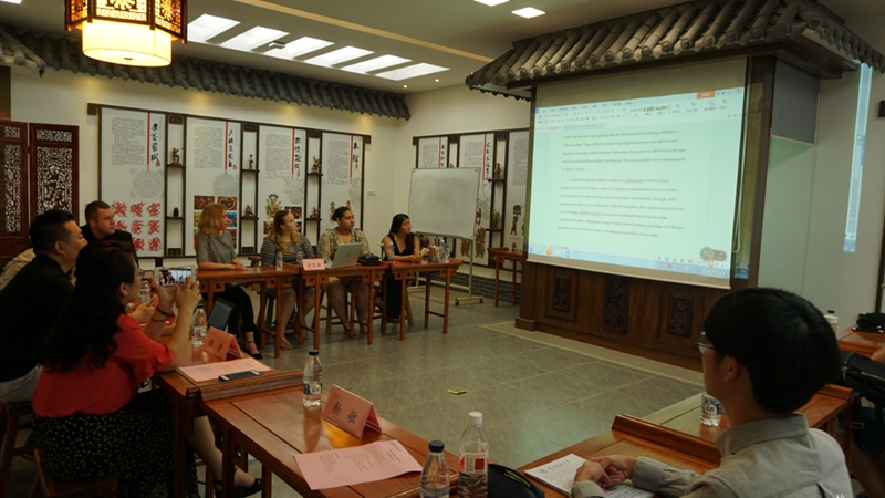 来自美国博林格林州立大学的5名学生分为两组做研修汇报,两组分别以当今中国社会中的环境污染、“剩女”现象为题,阐述自己的调查结果和观点看法,随后,中方语言小伙伴和美方学生就上述问题进行了讨论。研修汇报结束后,中美双方带队老师及项目负责人予以点评,对学生们的精彩表现给予了赞扬,为学生们对知识的活学活用感到欣慰,并勉励大家回到美国之后继续加强对中国传统文化及当今社会状况的学习和了解。