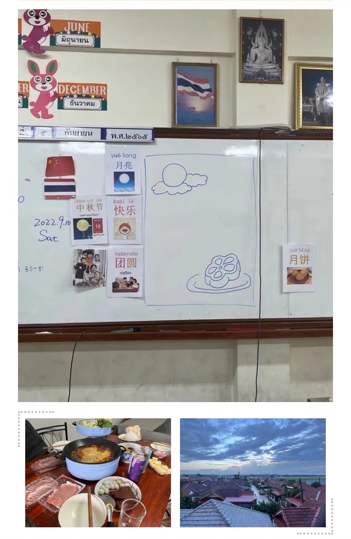 又是一年中秋佳节,但2022年的中秋节对于我来说是一个非常特别的中秋节,这一天是我来泰国任教的第30天,这一个中秋节也是没有家人和朋友陪伴的第一个中秋节,在这一刻我真真切切地感受到了“海上生明月,天涯共此时”的心情,但是丹麻刊低亚中学的老师和孩子们却带给我家人般的温暖,我们一起举办了中秋节文化活动,在这里我们向学生们介绍中秋节,和他们一起品尝月饼,度过了一个充实而快乐的中秋节。值此之际,祝愿在海外任教的志愿者教师节日快乐,也祝愿在国内的你们中秋节快乐!“月”来越幸福。