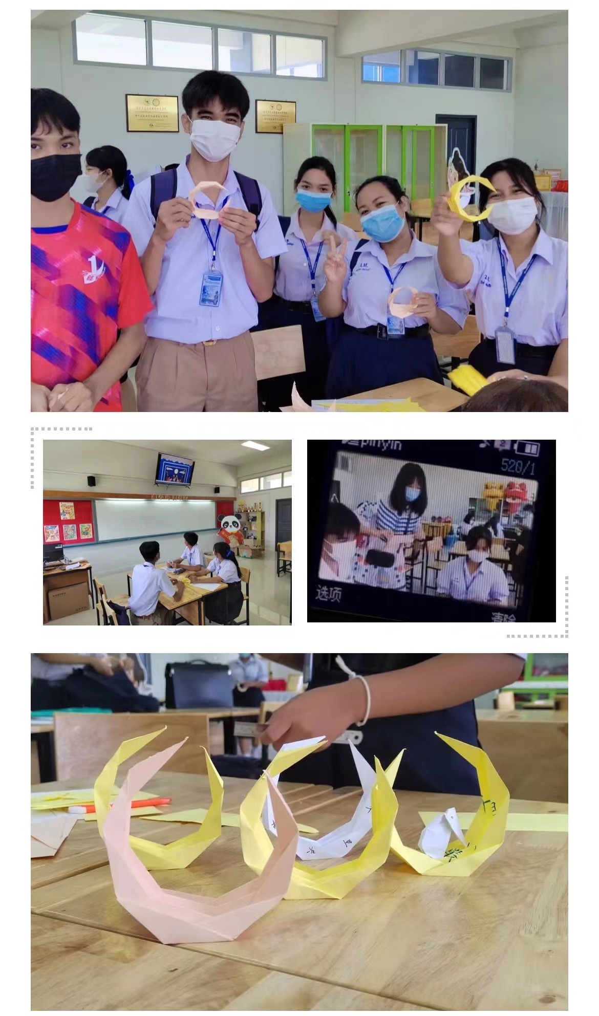 我们的中秋课堂分为了两部分,前半节课给学生们讲中秋的来源和相关的习俗。泰国的学生很热爱表演,在给他们讲后羿射日和嫦娥奔月故事的时候,他们一边听故事一边把自己代入情节,听到后羿回家发现嫦娥不见了,班上孩子们都很配合,哭哭啼啼地学后羿嚎叫“嫦娥——你快回来”,边喊还边拿出纸巾擦擦眼泪。后半节课带着大家做手工,用彩色的卡纸折一轮弯月,折纸的难度有些大,学生这节课说的最顺溜的一句话大概就是这句“老师,太难了”。不过也没有人选择放弃,都坚持折到了最后,最后手里拿着自己亲手折出的月亮,孩子们都笑得很开心。