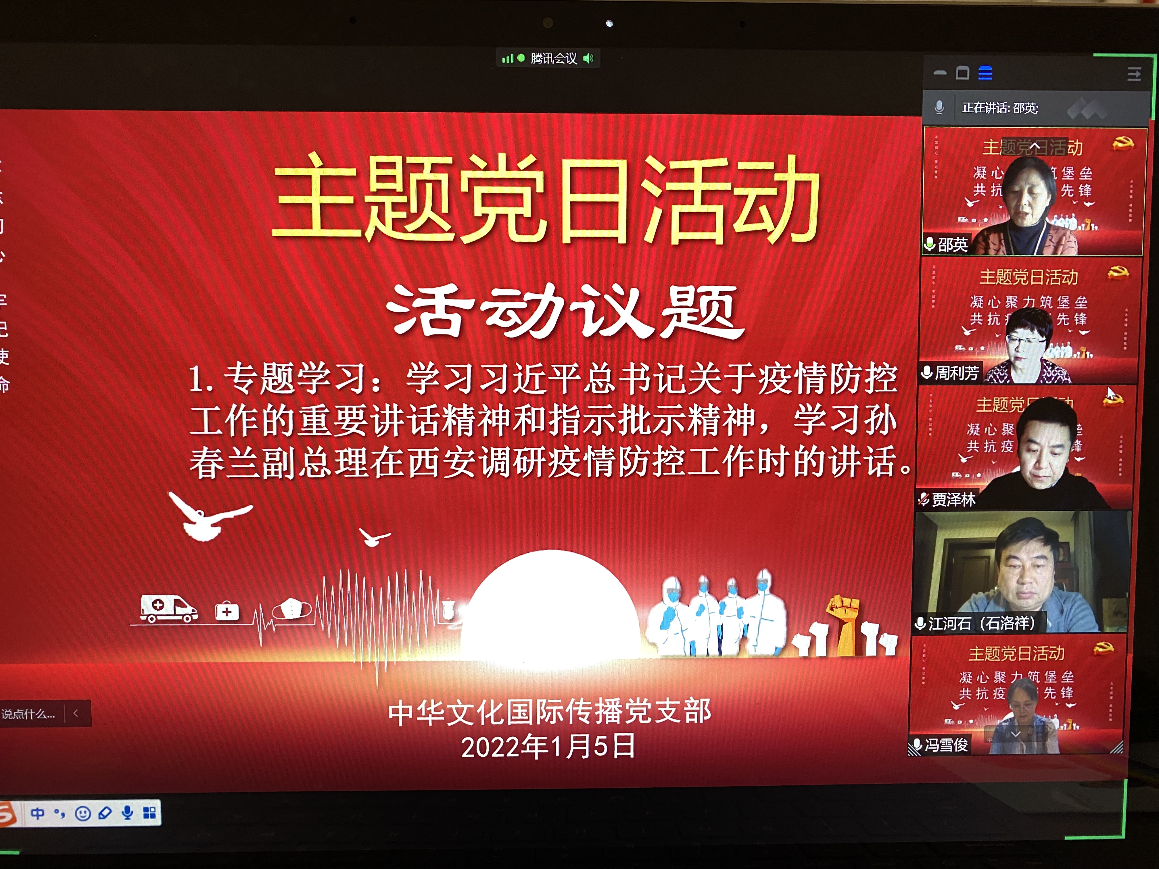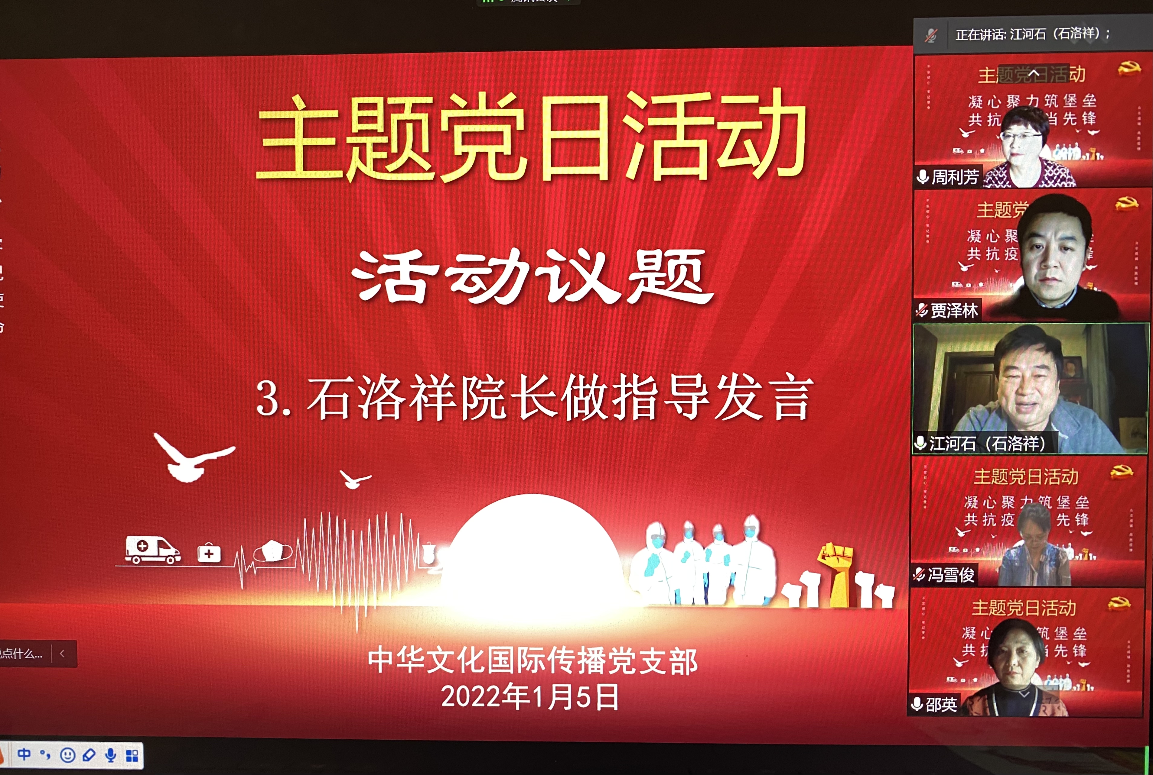 为了全面发挥教师党支部的战斗堡垒作用和教师党员的先锋模范作用,为坚决打赢疫情防控阻击战提供坚强的组织保证,2022年1月5日晚上,中华文化国际传播党支部全体党员汇聚云端,开展了“凝心聚力铸堡垒,共抗疫情当先锋”主题党日活动。活动由支部书记邵英主持,十三水