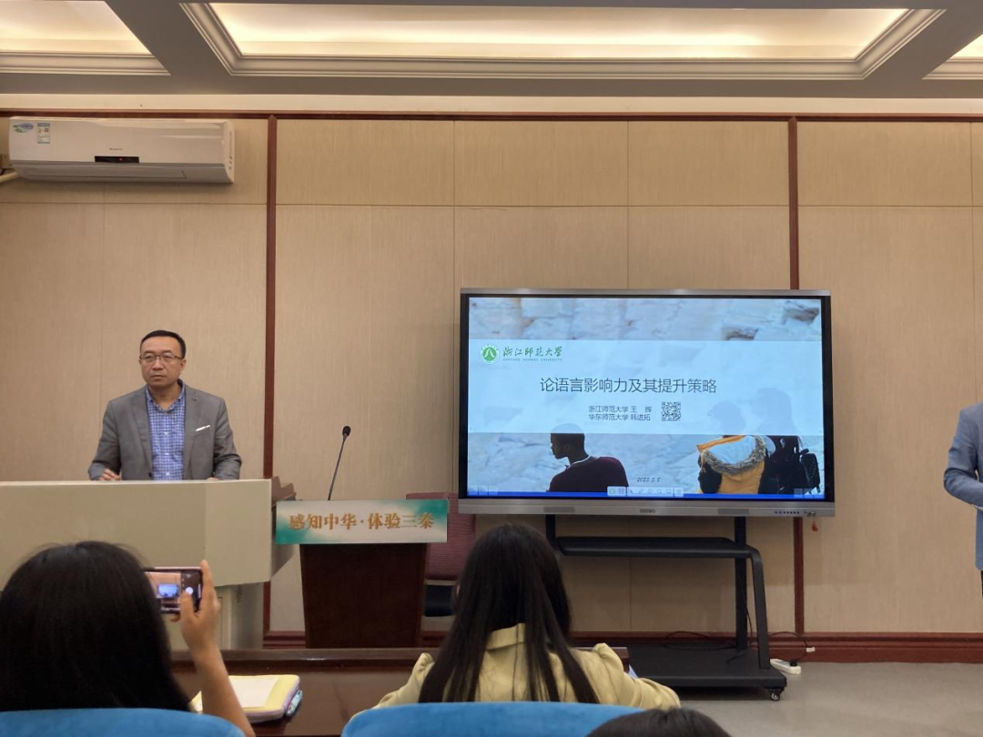 王辉教授从语言影响力、其产生机制以及语言影响力的量化评估方式三方面与同学们进行交流。首先,王辉教授从语言传播的视角对语言影响力的内涵作出界定。其次,语言影响力的影响因素包括该语言包蕴信息的丰富程度、文字体系的有无、语言使用者的绝对数量三种。第三,王辉教授从个人、组织、国家三个层面出发对语言国际影响力进行了评价,得出汉语的影响力位列数据收集范围内第五。如何提升汉语影响力?第一,要从英语国际传播中汲取养分;第二从二语人口规模来看,还需要增加中文的吸引力;第三,应当重视并发挥汉语与中国文化传播事业的中坚力量华人华侨在中文国际传播中的作用;第四,我们需要重视中文在国际组织中的地位规划;第五,我们应当与各国教育部分保持密切合作,推动中文纳入海外各国国民教育体系。